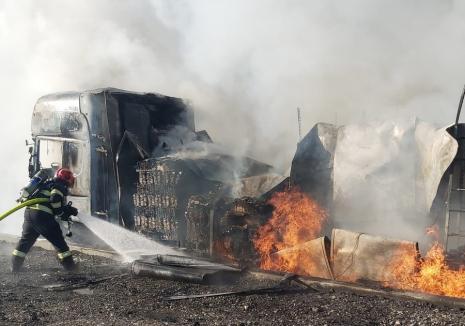 Un TIR a fost distrus în totalitate, după ce a fost cuprins de flăcări, în curtea unei firme de pe Șoseaua Borșului din Oradea. Incendiul a fost unul deosebit de violent și amenința să cuprindă și alte camioane, dar și o hală din apropiere.