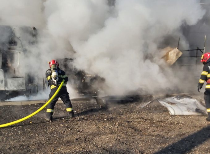 „La sosirea forțelor de intervenție, ardeau violent și generalizat un cap tractor și semiremorca acestuia, existând un risc ridicat de propagare a incendiului la o hală de depozitare mărfuri, situată la mai puțin de trei metri de focare și la alte TIR-uri aflate în imediata proximitate”, arată ISU.